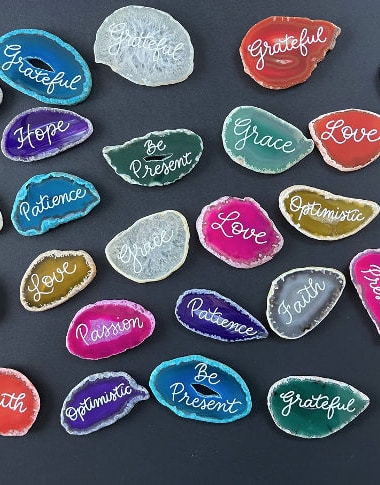 Geodes are hollow, spherical rocks with an interior lined with crystals or mineral deposits. The only thing that will sparkle more than them is the words painted on them!