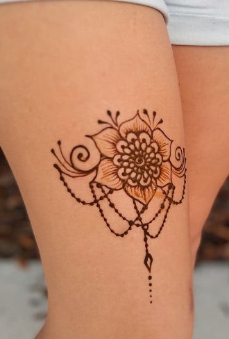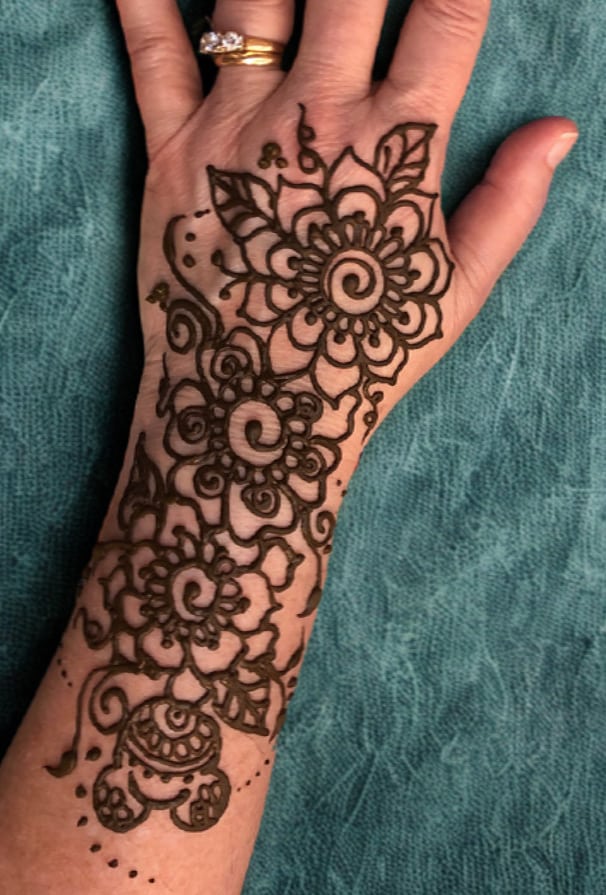 Our henna is all natural. The henna leaves are crushed into a fine powder, mixed with water to form a paste and then applied to the skin. As the paste dries, the solution penetrates the outermost layer of skin, leaving a reddish-brown stain or “tattoo “. Typically, the longer the henna paste remains on the skin, the deeper the tattoo’s color.