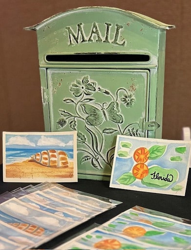 For larger events, postcards can be painted ahead of time. Upgrade options available include custom branding and a protective sleeve.