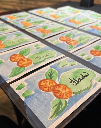 One of our top bookings, our Watercolor Postcard artists paint original pieces for your guests using beautiful watercolors, and all card paintings are designed to match the theme of your event!